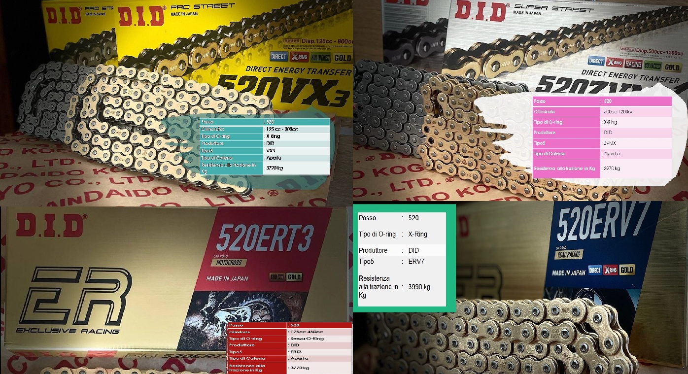 Le catene dei nostri kit trasmissioni sono tutte DID originali made in Japan di prima scelta.
